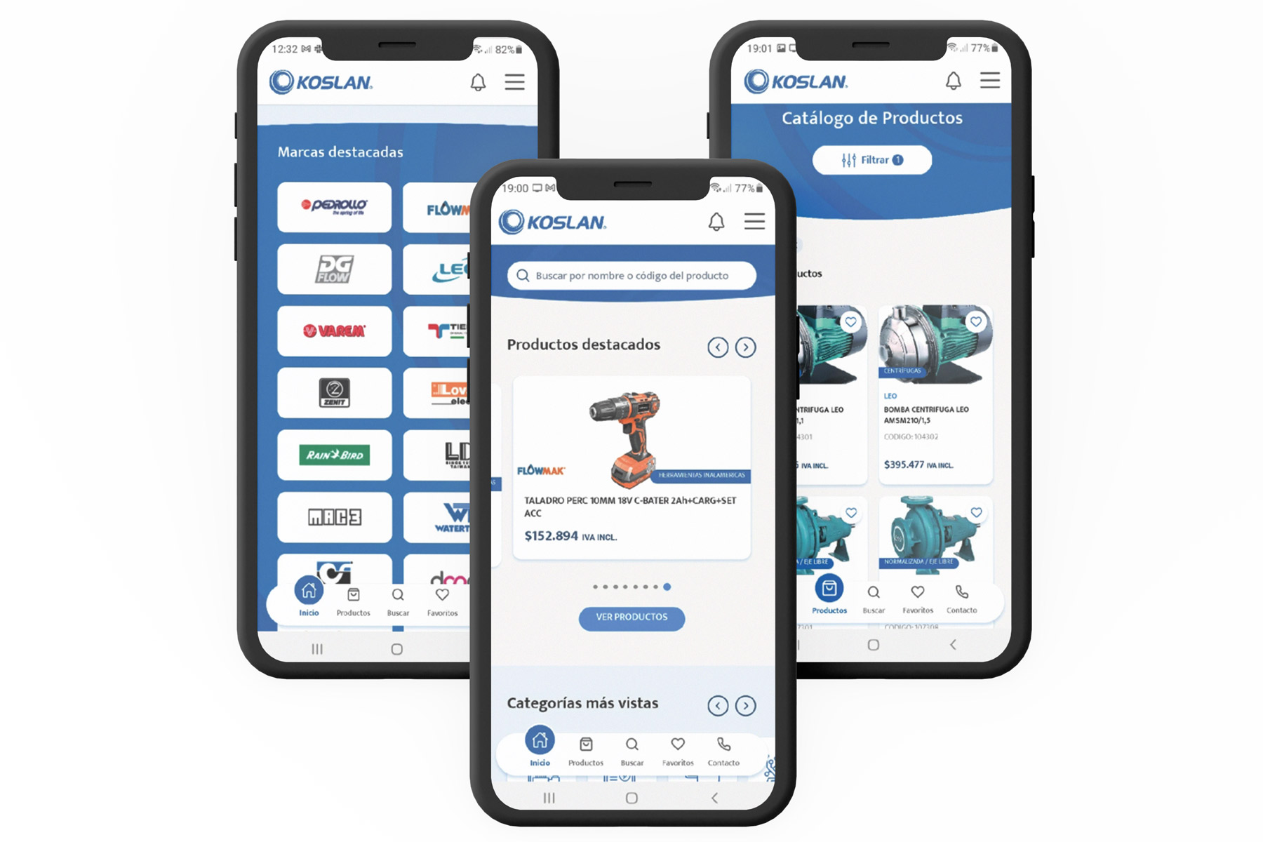 Koslan (iOS & Android) – Aplicación móvil desarrollada a medida con enfoque en experiencia de usuario y funcionalidad, que permite explorar de forma intuitiva el completo catálogo de productos técnicos para el movimiento de agua (bombas, válvulas, riego, filtrado, instrumentación y herramientas), acceder a fichas técnicas detalladas y consultar información de marcas representadas en Chile. La app ofrece navegación clara, acceso eficiente a especificaciones de productos y está optimizada para adaptarse a dispositivos iOS y Android, facilitando una experiencia ágil y accesible desde cualquier lugar.